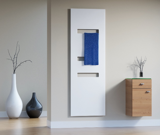 De moderne en minimalisrtische Atelier Highline is er in drie uitvoeringen met briljant, wit echtglasfront en naar keuze met witte of grafietzwarte metalen frontpaneel. Met drie praktische uitsparingen voor het opwarmen en drogen van handdoeken.