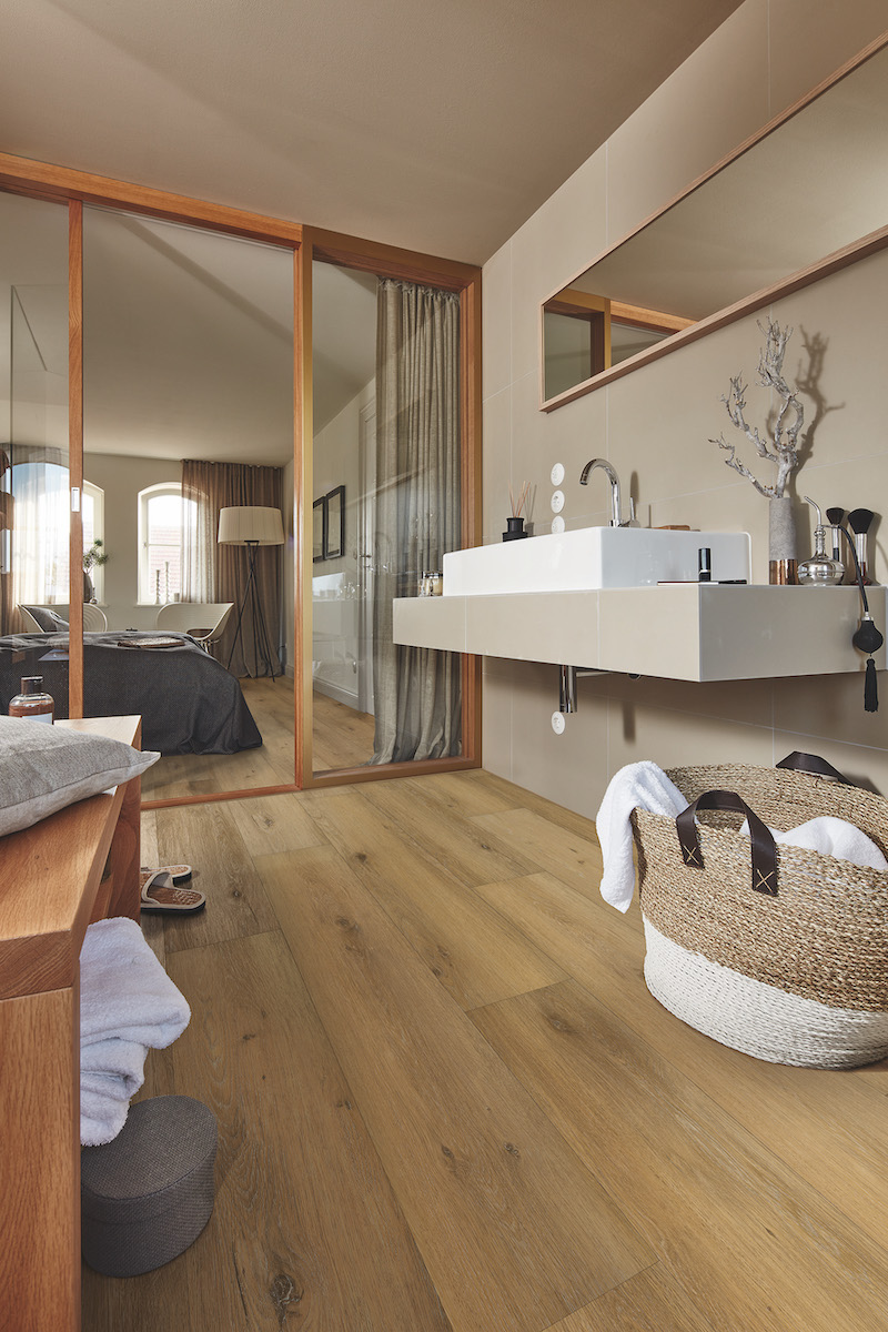 Met de vinylvloeren van Moduleo is het mogelijk om een vloer met houtlook in de badkamer te plaatsen. Door de voelbare nerven en groeven zijn de dessins van Moduleo bijna niet van echt hout te onderscheiden. De vloer is waterbestendig en onderhoudsvriendelijk en daardoor ideaal voor de badkamer en keuken. Bovendien is er ruime keuze uit verschillende kleuren en afwerkingen.